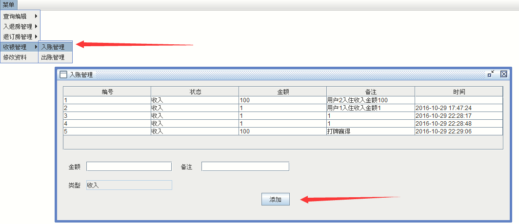 cashier.setRemarks("用户"+name+"入住收入金额"+money);